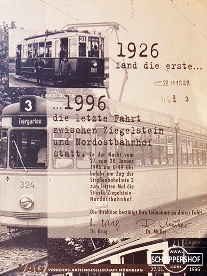 In der Nacht vom 27. zum 28. Januar 1996 um 0:49 Uhr befuhr ein Zug der Straßenbahnlinie 3 zum letzten Mal die Strecke Nordostbahnhof nach Ziegelstein. Die »gute alte 3er« , die letzte Linie der Straßenbahn nach Ziegelstein wurde an diesem Tag Geschichte.