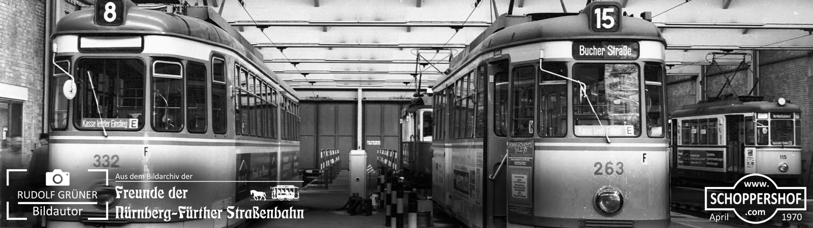 Der im Jahre 1963 eröffnete Straßenbahn-Betriebshof Nordost an der Elbinger Straße. Die Straßenbahn Triebwagen 332, 263 und 115 in der Abstellhalle.