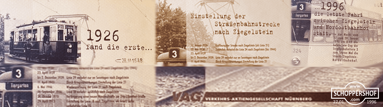 In der Nacht vom 27. zum 28. Januar 1996 um 0:49 Uhr befuhr ein Zug der Straßenbahnlinie 3 zum letzten Mal die Strecke Nordostbahnhof nach Ziegelstein. Die »gute alte 3er« , die letzte Linie der Straßenbahn nach Ziegelstein wurde an diesem Tag Geschichte.