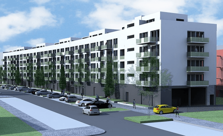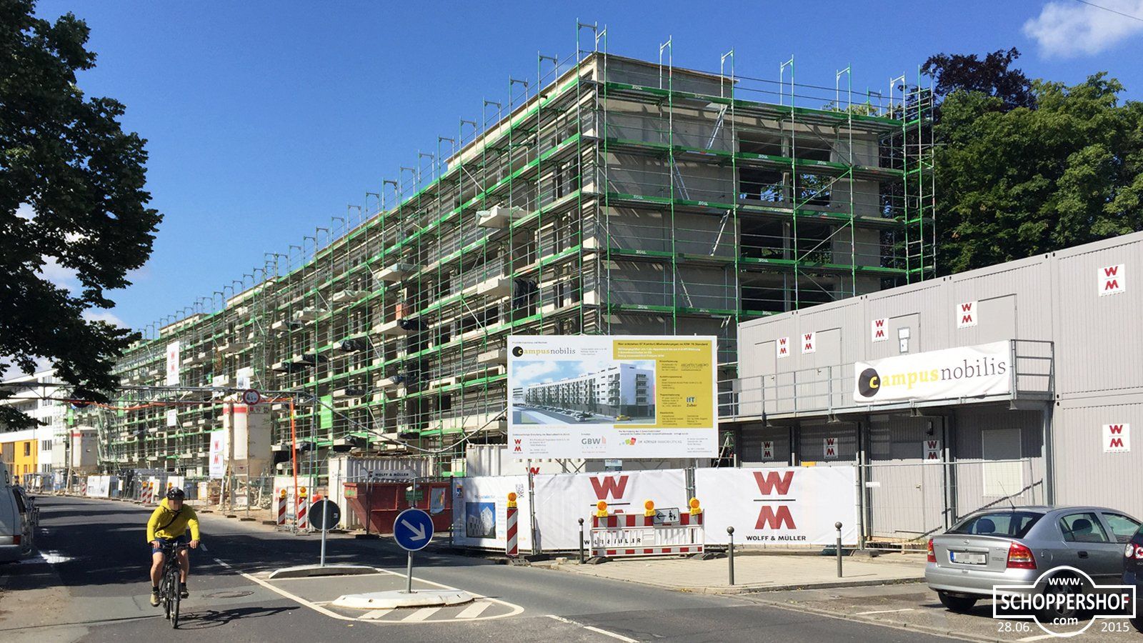 Acht Monate nach dem ersten Spatenstich sind an der Baustelle »Elbinger Höfe« in der Elbinger Straße die zwei großen Baukrane verschwunden, der Rohbau der Wohnanlage ist damit abgeschlossen.