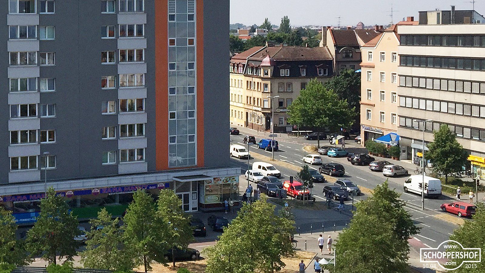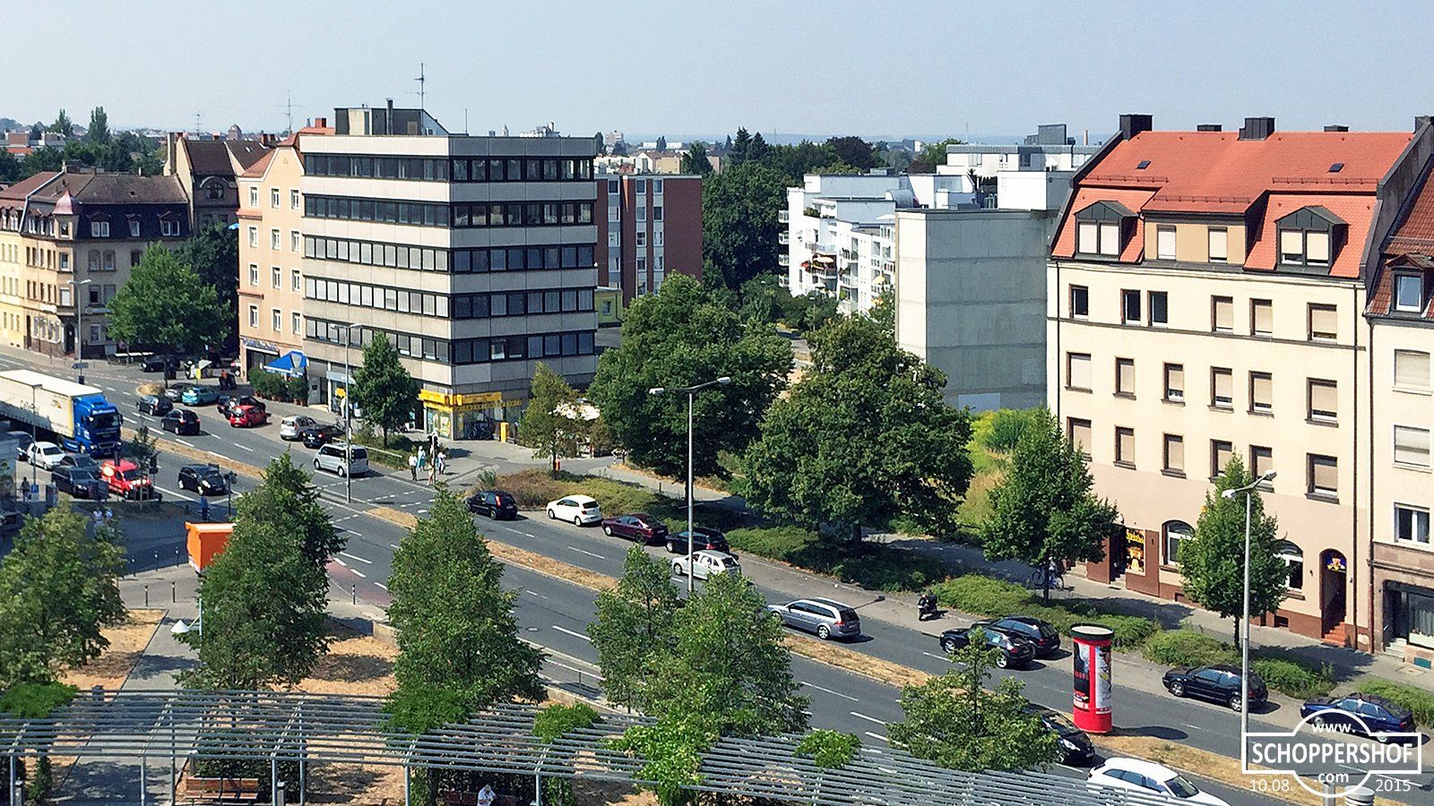 Blick vom Delphinhaus über den Leipziger Platz zur Äußeren Bayreuther Straße und den Stadtteil Schleifweg.