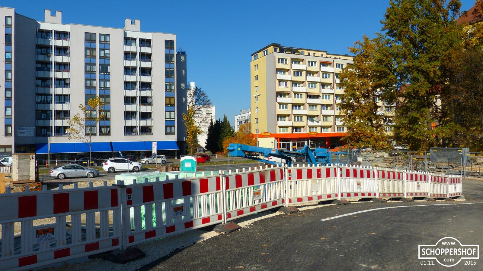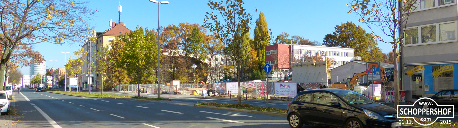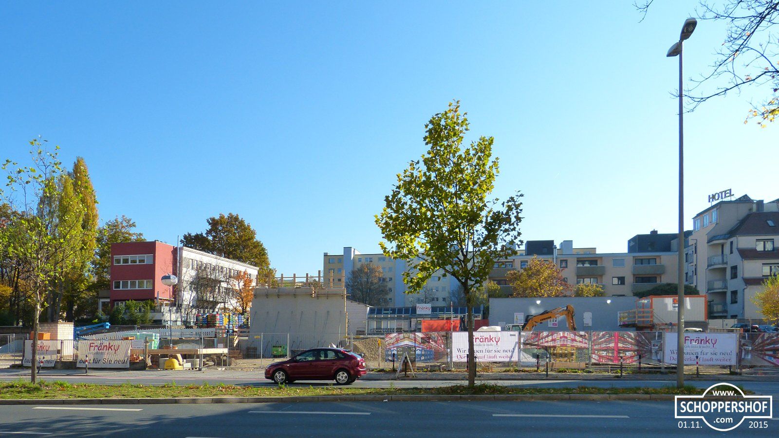 Wie wir der Bautafel entnehmen konnten, baut hier der Getränkemarkt Fränky ein neues Gebäude für seinen Markt mit zwei Loftwohnungen, Büro und zwei Stadthäusern.