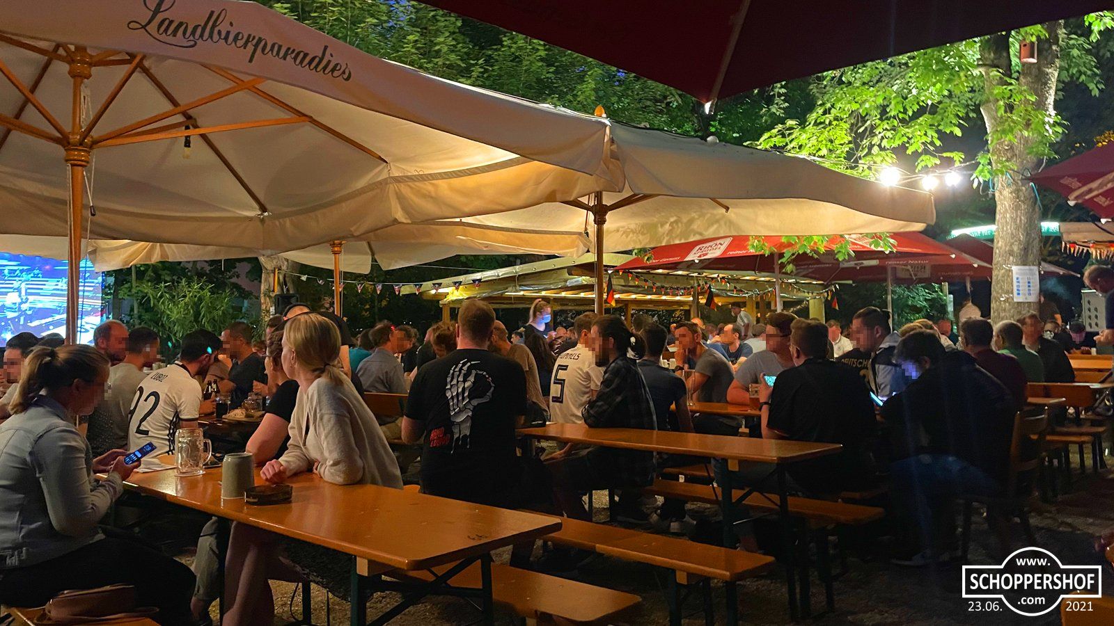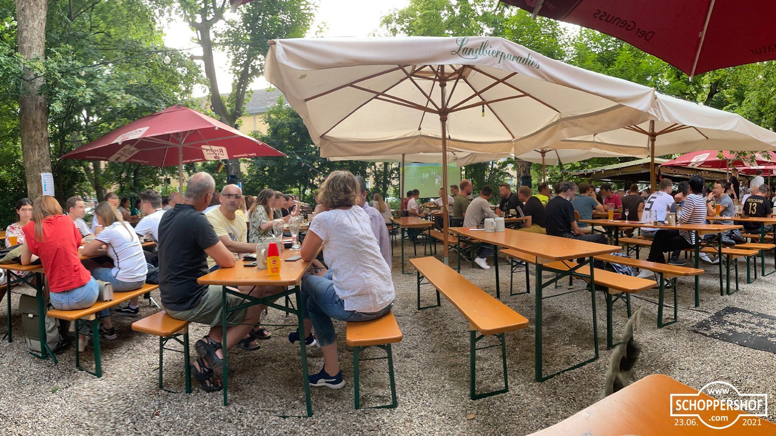 Wir verfolgten das Spiel bei begeisterter Atmosphäre im Landbierparadies Nordost in der Leipziger Straße. Der Biergarten war gut besucht und die Gäste könnten bei warmen Sommertemperaturen und einen frisch Gezapften das Spiel auf der Großbildleinwand verfolgen.