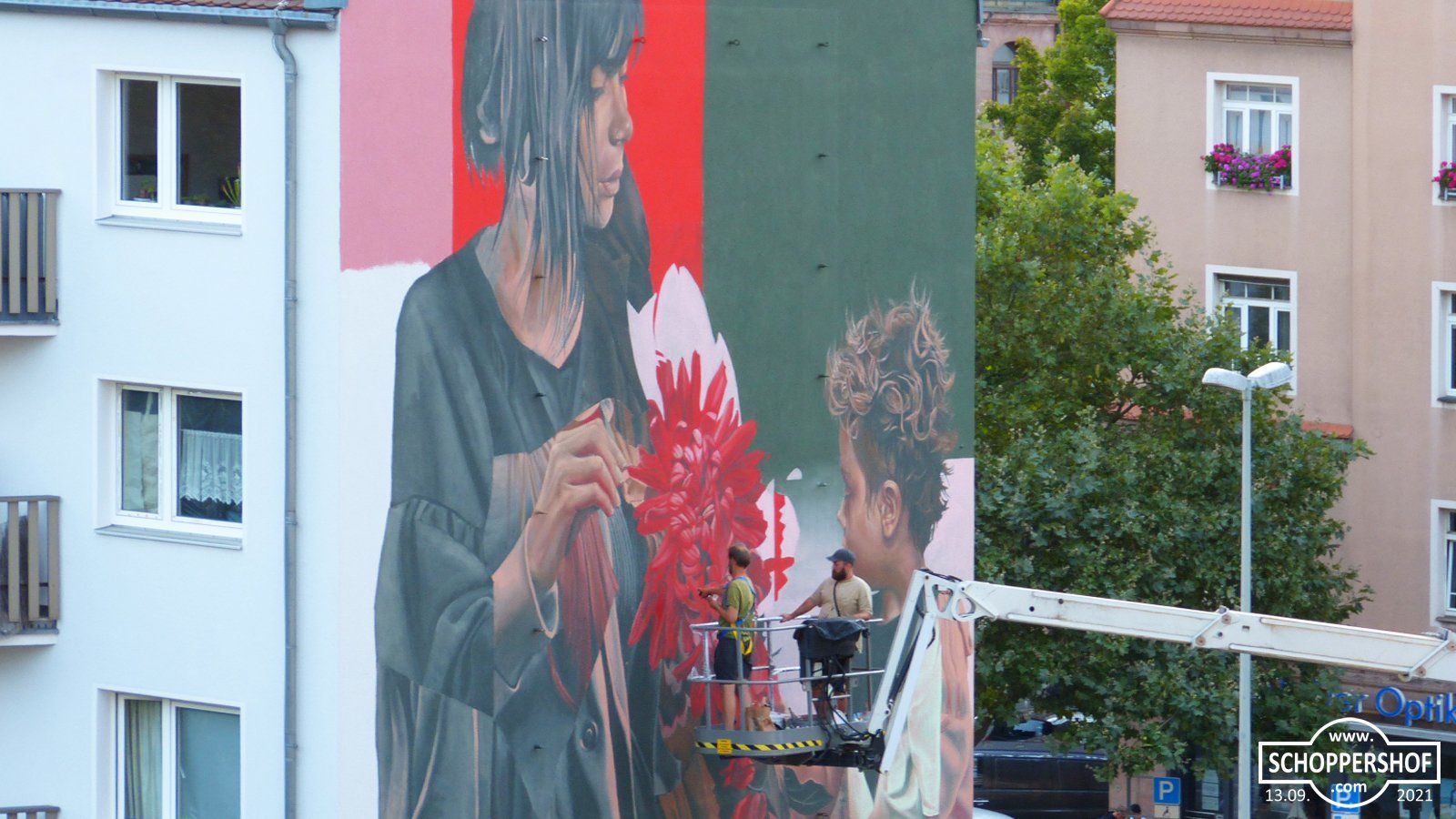 "Das Motiv »Frau mit Kind und Chrysantheme«, welches die Künstler frei bestimmen konnten, soll die Verbundenheit und Nähe über Generationen hinweg zum Ausdruck bringen.
