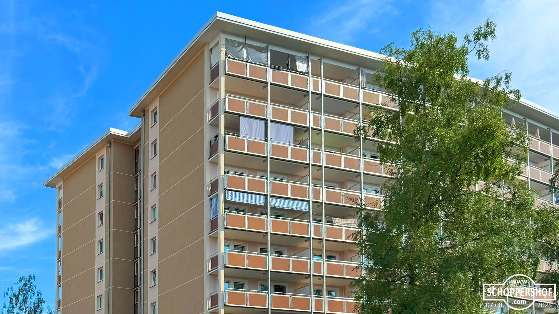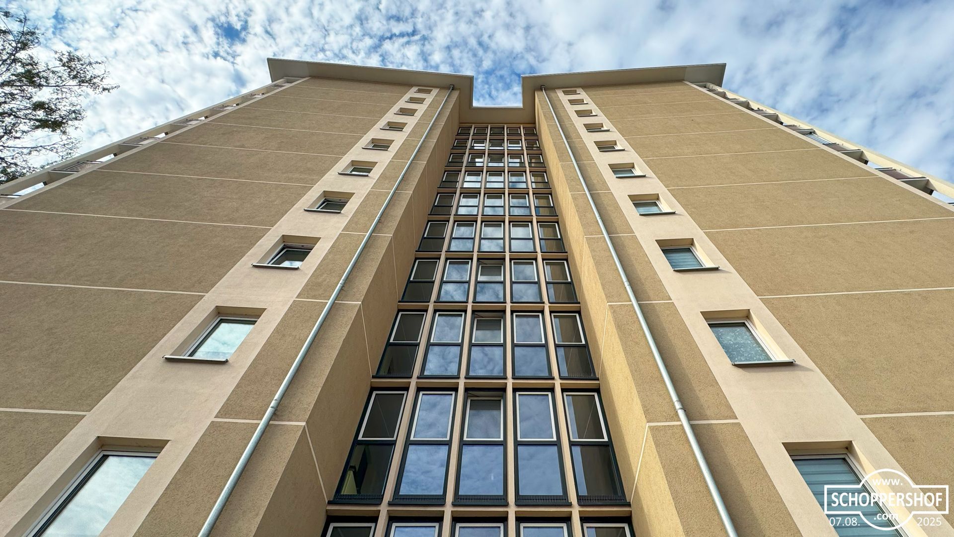 »Deutschen Gesellschaft für Wohnbau« verfügt über etwa 132 Wohnungen und besticht von Außen nicht nur durch seine Höhe. Besonders markant sind die keilförmig in der Mitte vorspringenden Fassaden mit ihren langgezogenen Balkonen und die auffällig an der Nord- und Südseite zurückgesetzten Treppenhausschächte.