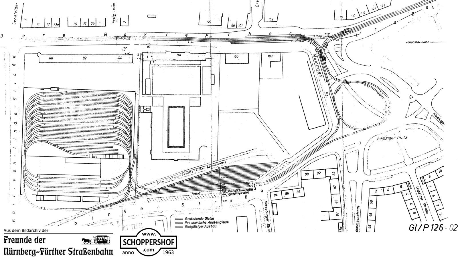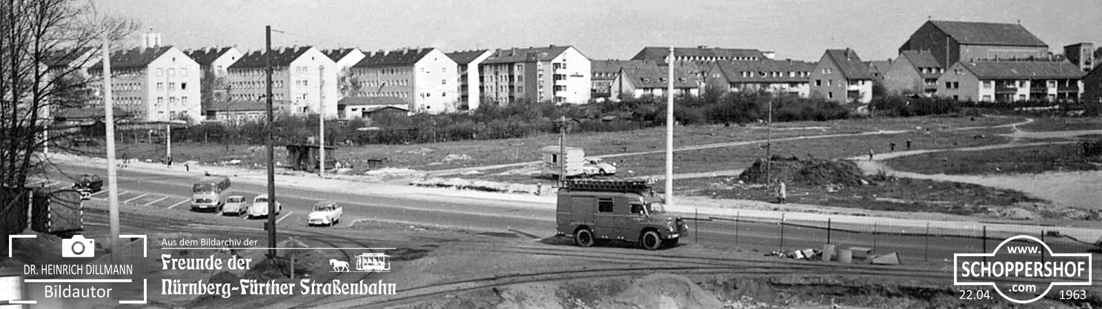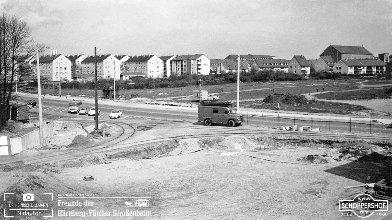 Seit Oktober 1961 entstand auf dem Areal zwischen der Elbinger Straße, der Carl-von-Linde-Straße und der Äußeren Bayreuther Straße der neue Straßenbahn-Betriebshof Nordost. Hier der Blick von der Baustelle in Richtung Elbinger Straße am 22. April 1963.