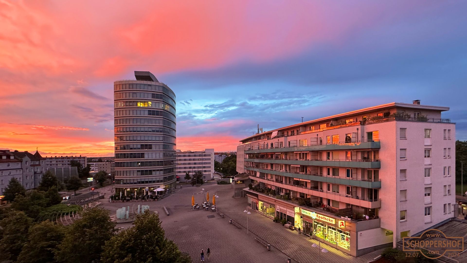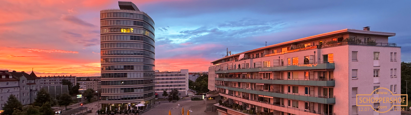 Am 12. Juli 2024 gegen 21:30 wurden die Wolken über der Stadt einzigartig herrlich von der hinter dem Horizont versinkenden Sonne mit warmen Farben angestrahlt.