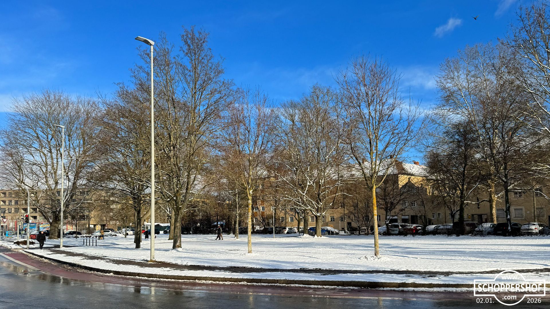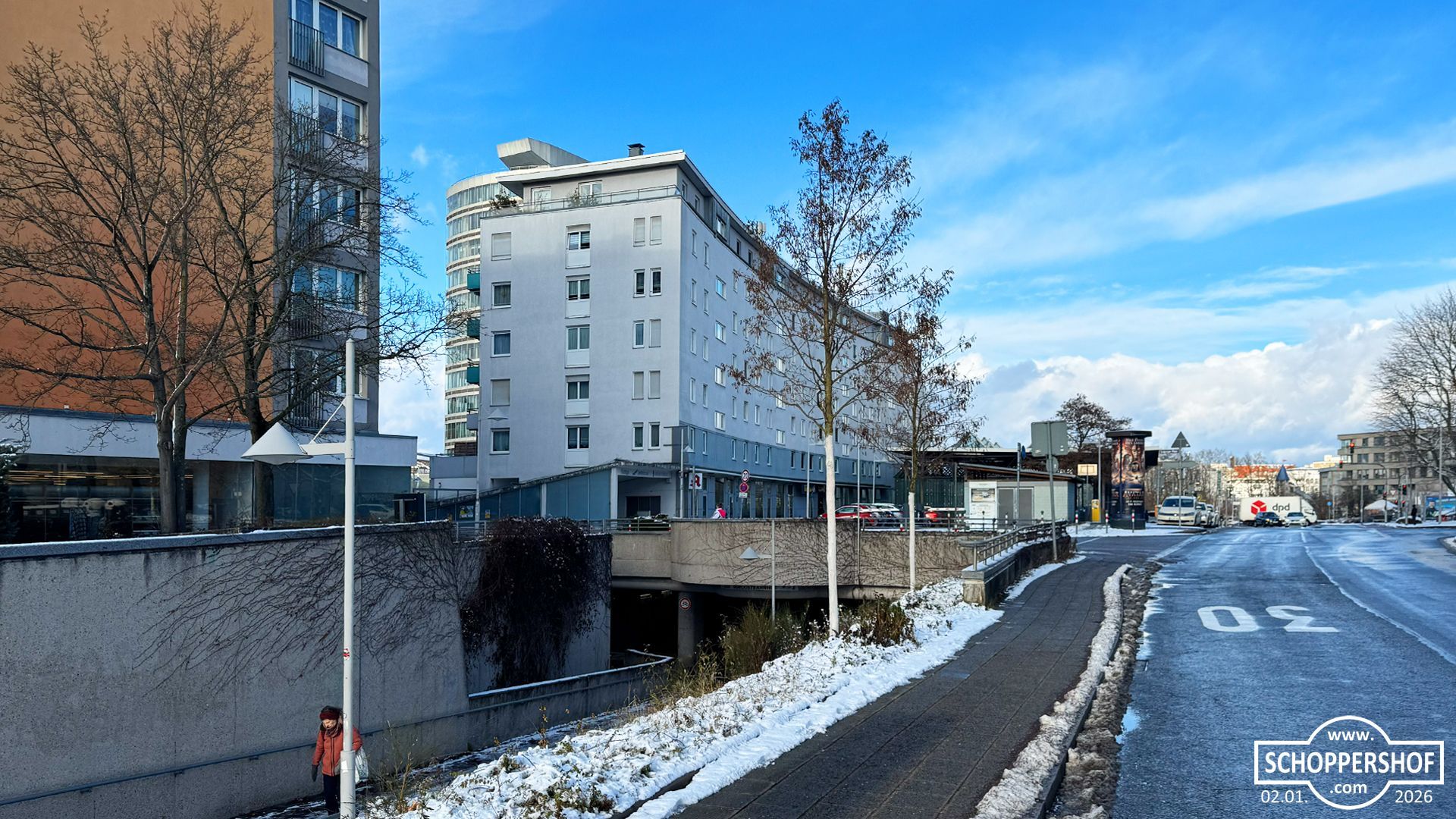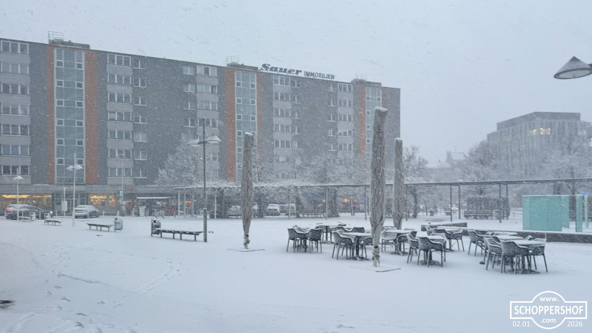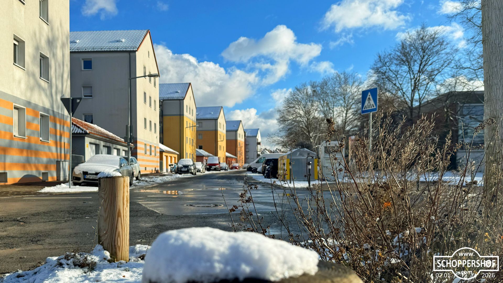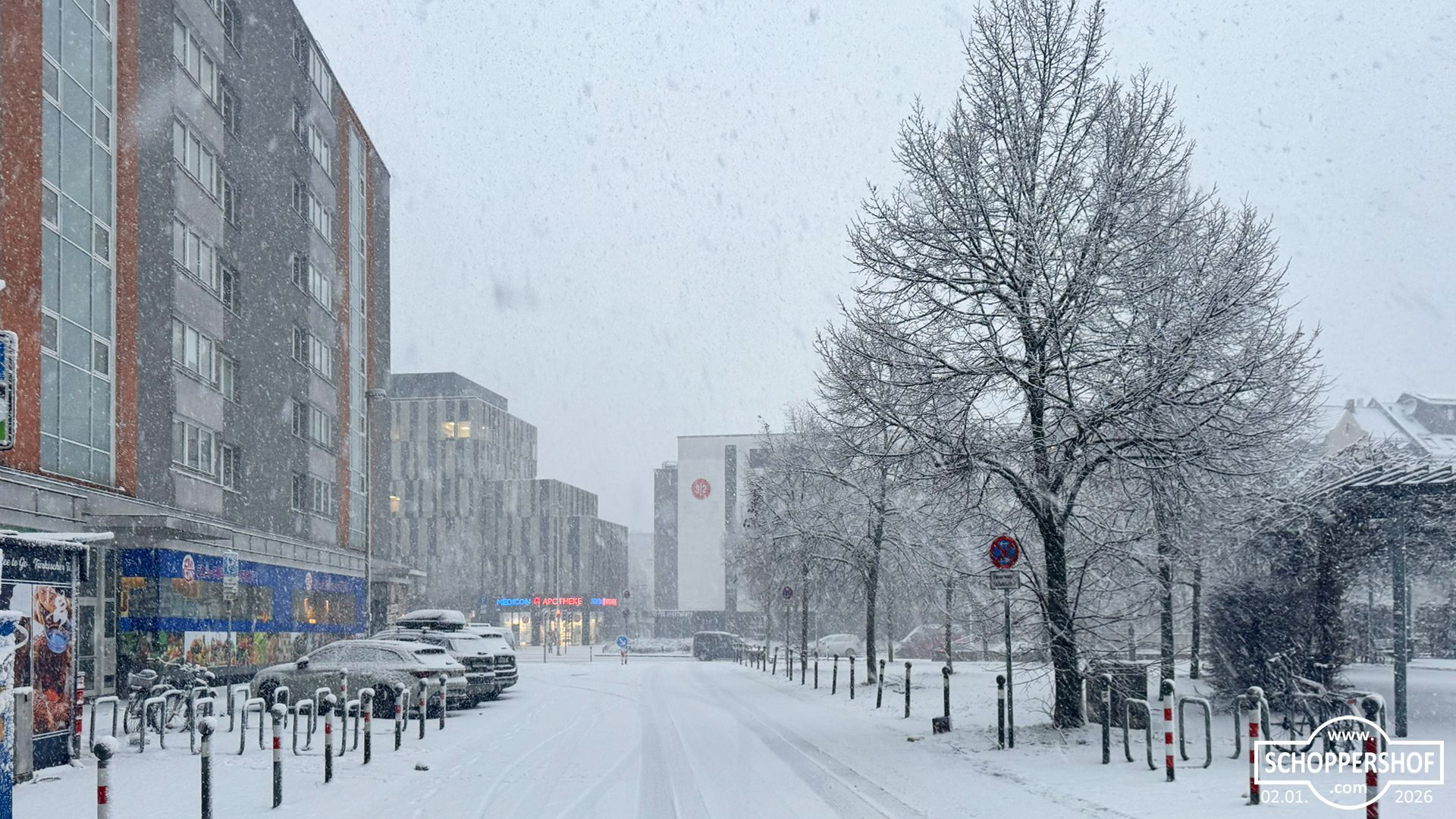 Schoppershof ist am Morgen unter einer zarten Schneedecke erwacht, ewige Schneeflocken fielen langsam vom Himmel und es war düster und grau. Mit voller Power räumte der Winterdienst die Straßen im Stadtteil.