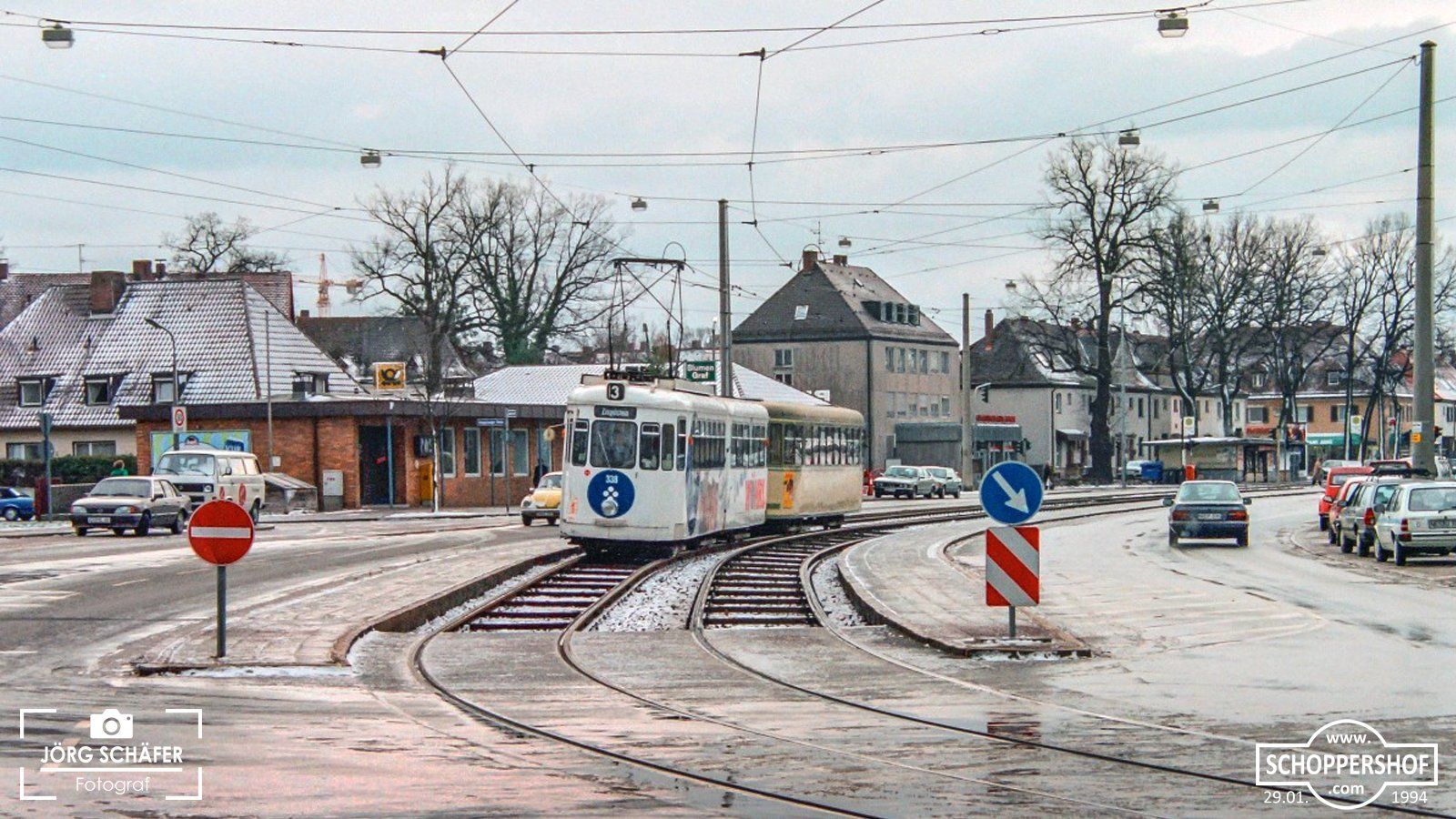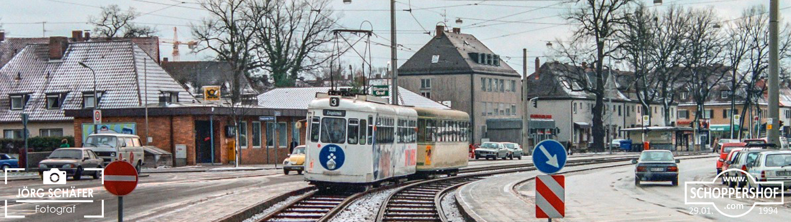 Die Straßenbahn Linie 13 im Jahre 1994 vom Nürnberger Hauptbahnhof über Nordostbahnhof kommend bei ihrer Ankunft in Ziegelstein.