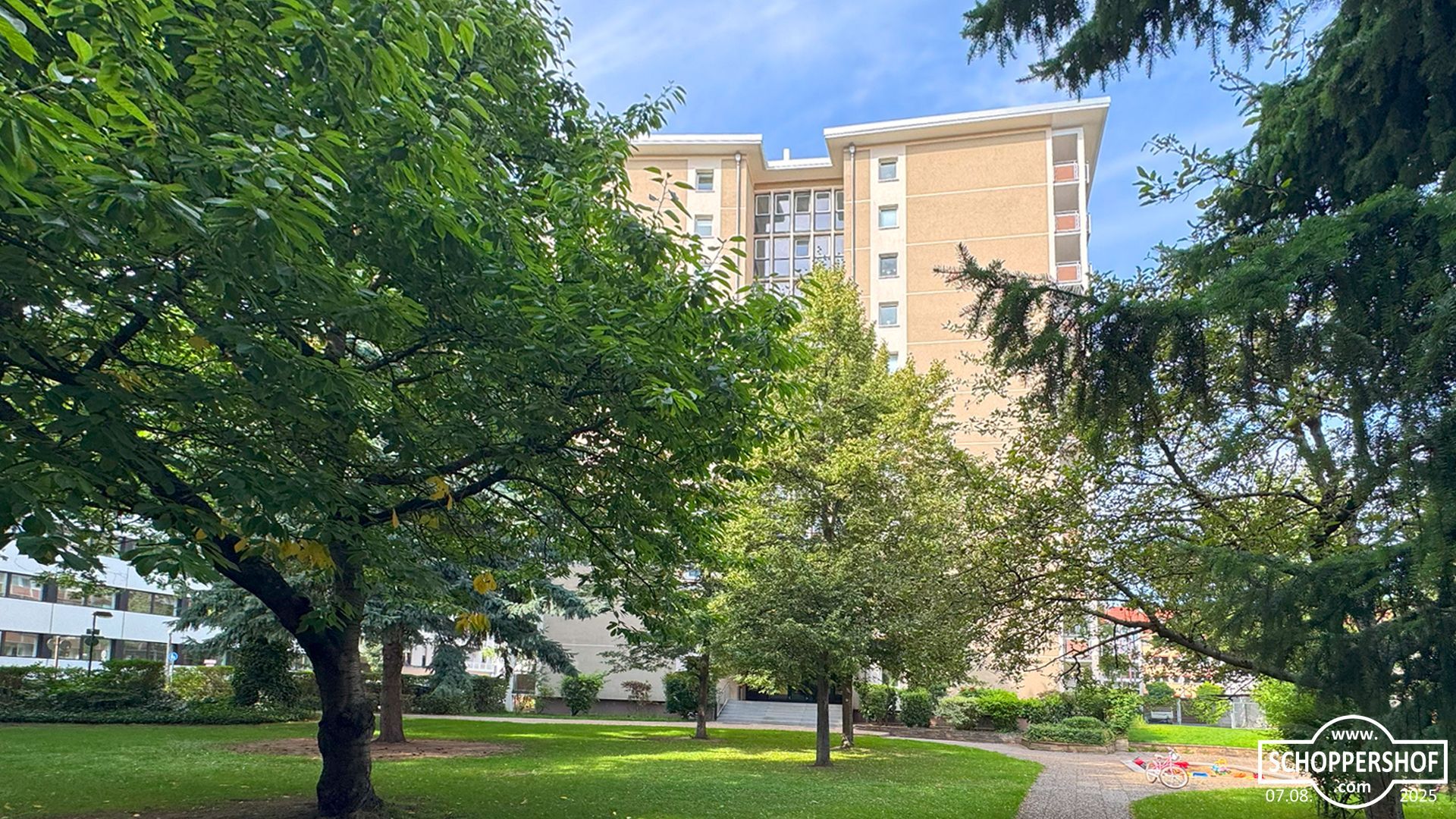 »Deutschen Gesellschaft für Wohnbau« verfügt über etwa 132 Wohnungen und besticht von Außen nicht nur durch seine Höhe. Besonders markant sind die keilförmig in der Mitte vorspringenden Fassaden mit ihren langgezogenen Balkonen und die auffällig an der Nord- und Südseite zurückgesetzten Treppenhausschächte.